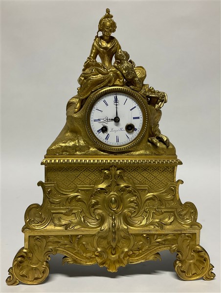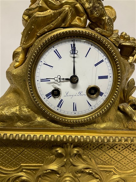 Leroy, Paris. Pendola in bronzo riccamente decorata a motivi rocaille a scene di genere. Quadrante in smalto bianco a numeri romani, movimento a due treni con suoneria delle ore e mezze su campanello. Secondo quarto del secolo XIX (h cm 38) (difetti, lancette sostituite)