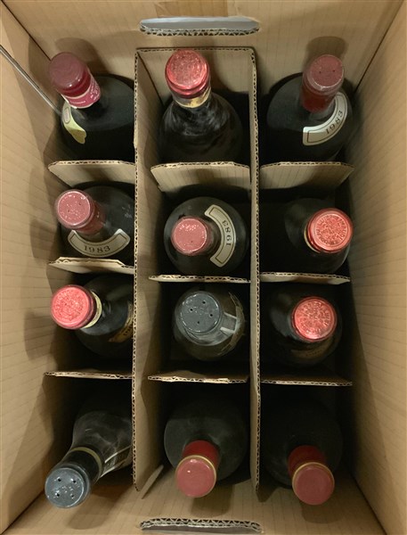 Cartone contenente numerose bottiglie (difetti alle bottiglie, alle etichette e