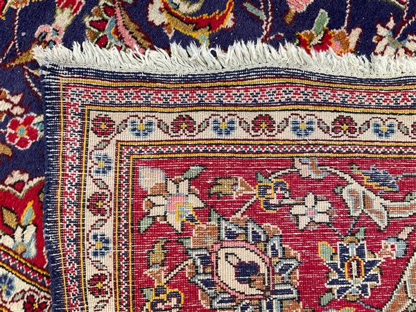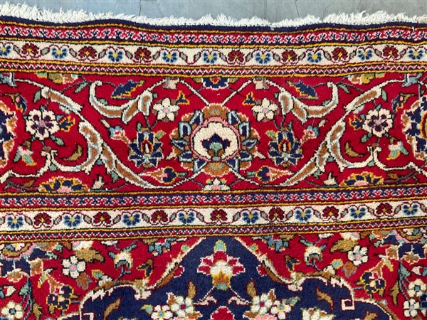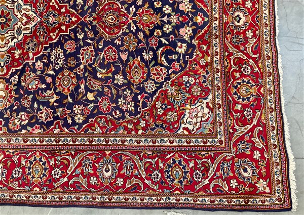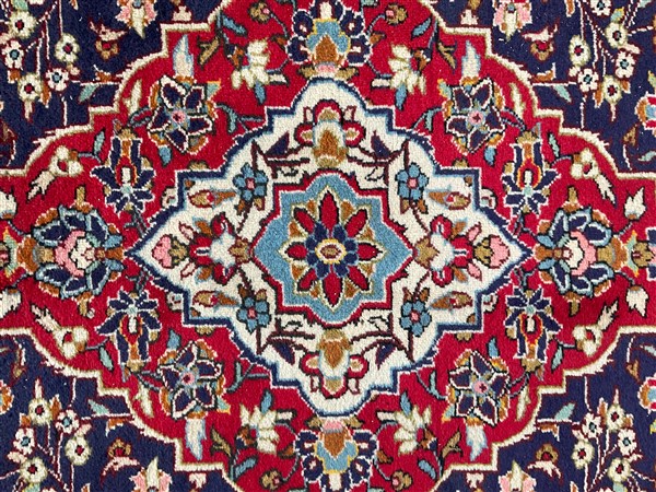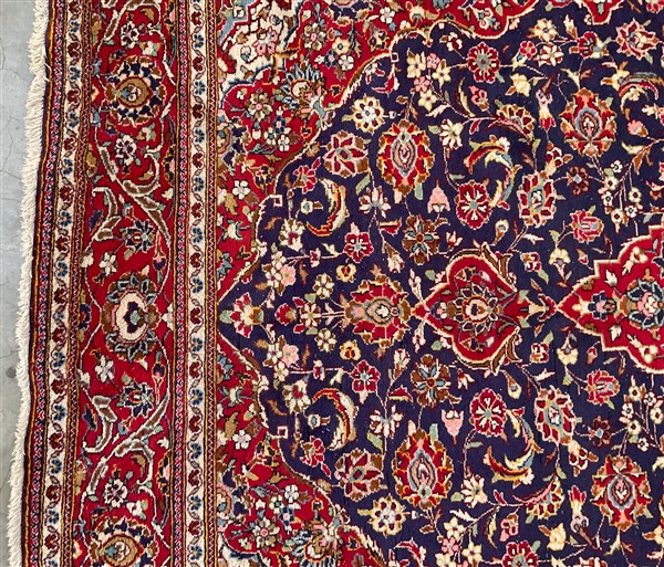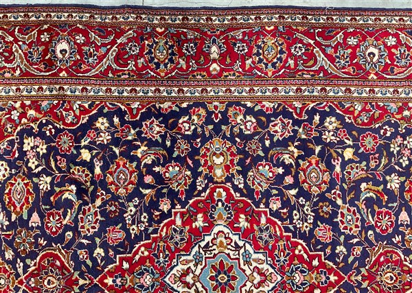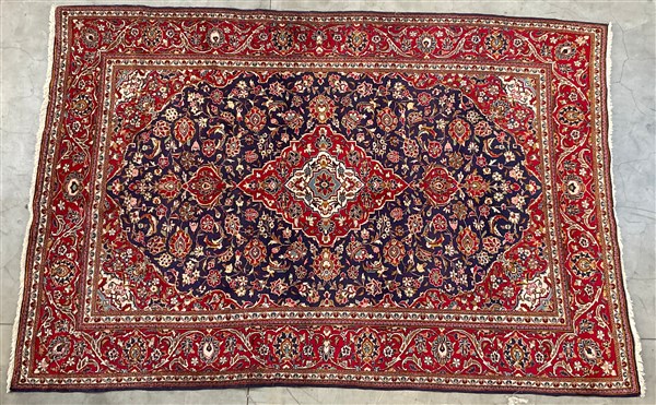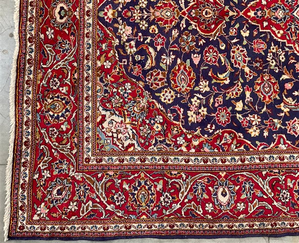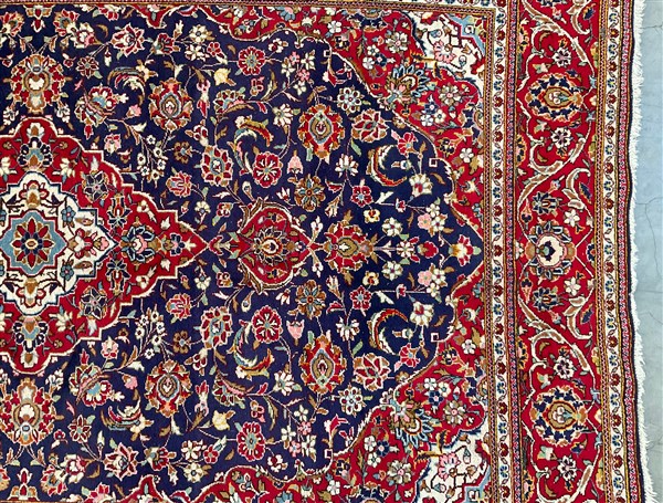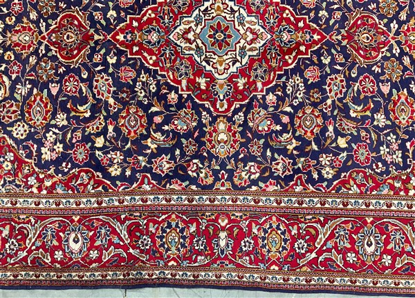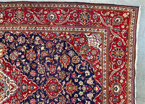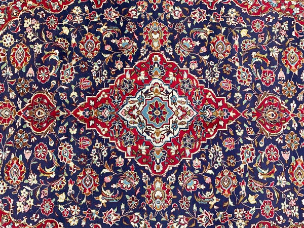 Tappeto Keshan, Persia, secolo XX. Decoro con medaglione lanceolato bianco, rosso e azzurro su campo blu scuro ornato da rami fioriti (cm 300x204) (difetti)