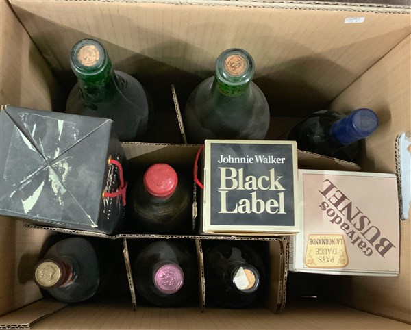 Cartone contenente numerose bottiglie (difetti alle bottiglie, alle etichette e