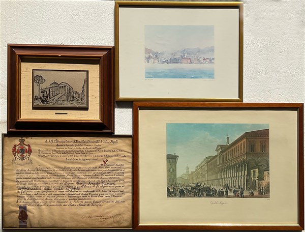 Lotto composto da numerose cornici contenenti riproduzioni, stampe ed una teca