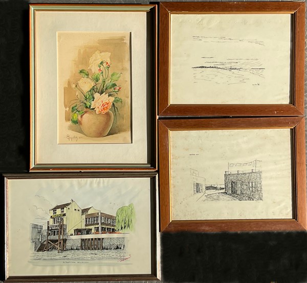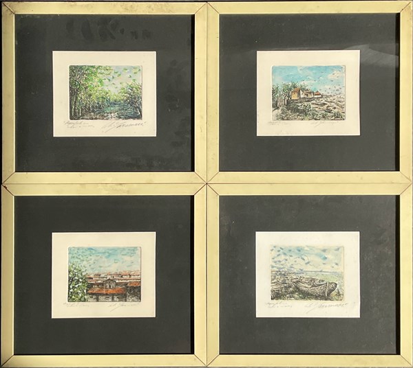 Cartone contenente sette stampe e due tecniche miste su carta, di soggetto, autori e misure diverse (misura mac cm 36x26) firmati