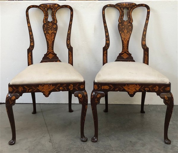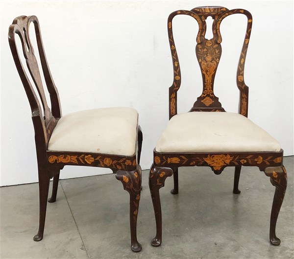 Coppia di antiche sedie olandesi intarsiate in legni di varie essenze a motivi floreali, schienale sagomato e gambe mosse (difetti)