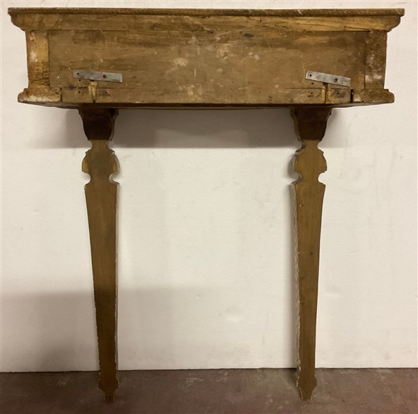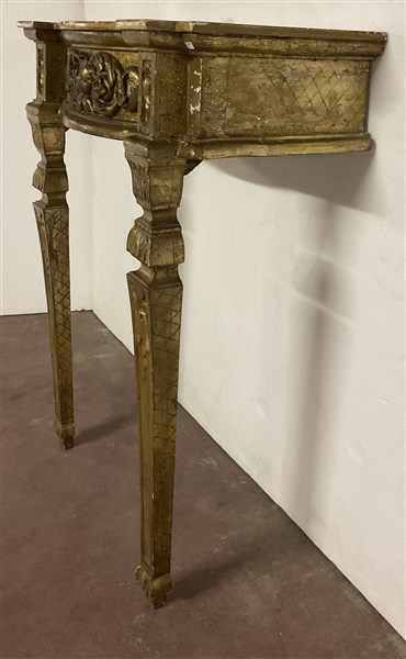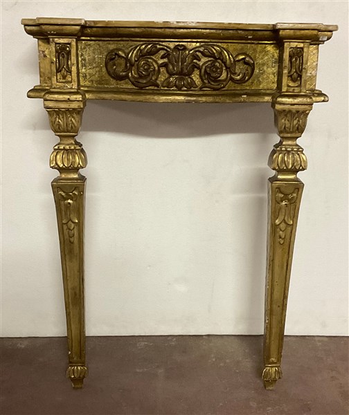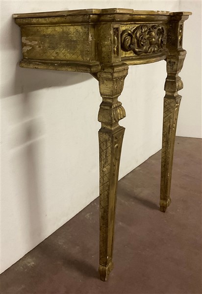 Antica consolle ad applique in legno intagliato e dorato, gambe rastremate e fr
