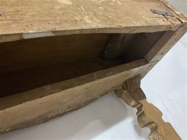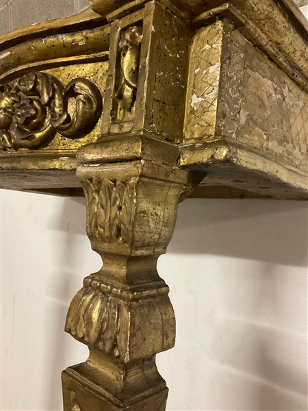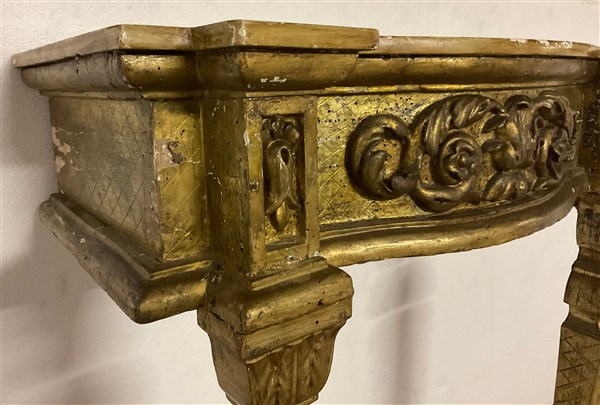 Antica consolle ad applique in legno intagliato e dorato, gambe rastremate e fronte con fregio a volute (cm 70x92x35) (difetti e rotture)