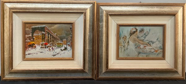 Coppia di retouché su lamina d'argento raffiguranti Amore e Musica e Colonne di San Lorenzo (cm 17x23,5) in cornici (difetti)