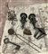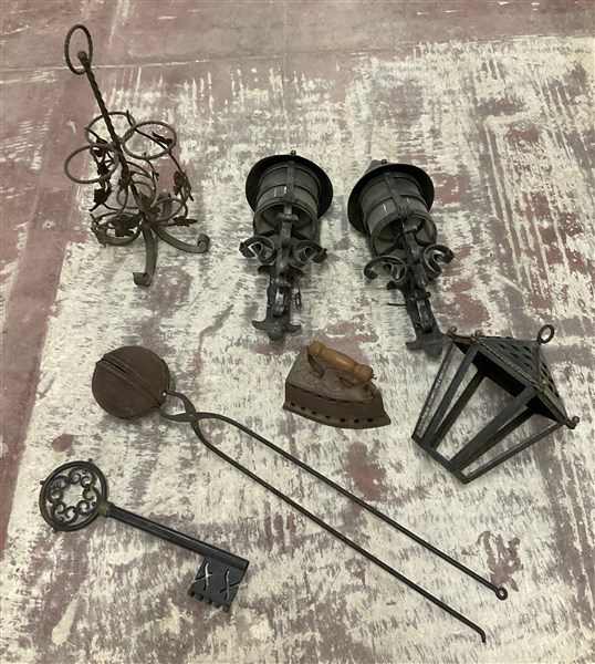 Cartone contenente due appliques, una lanterna, un porta bottiglie, una chiave, un ferro da stiro ed un utensile in ferro e metallo (difetti e mancanze)