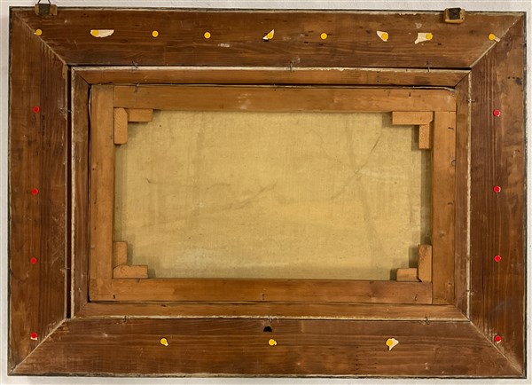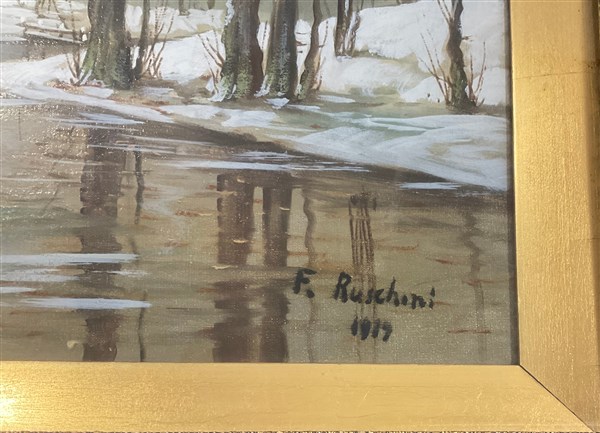 F. Ruschini, "Scorcio fluviale innevato" olio su tela (cm 36x60) Firmato e datato in basso a destra. In cornice