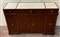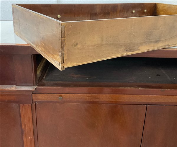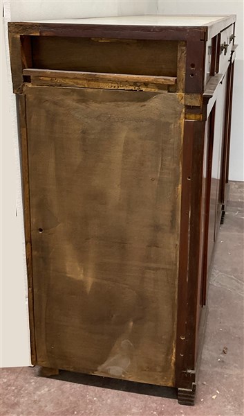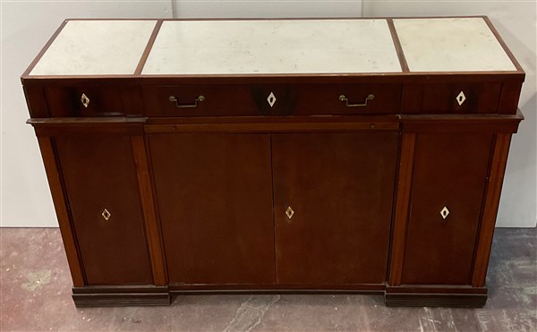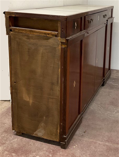 Credenza impiallacciata a cinque cassetti e sette sportelli, piano in marmo bianco incassato. Prima metà secolo XX. (cm 300x107x52) (Difetti)