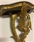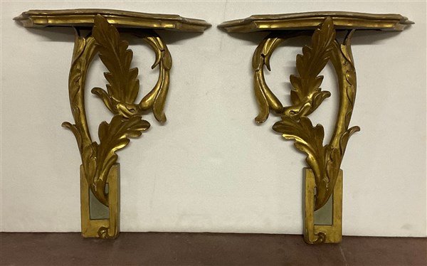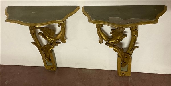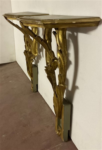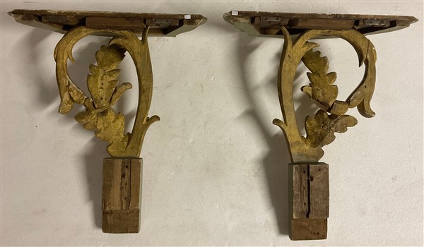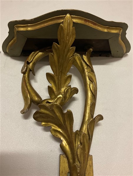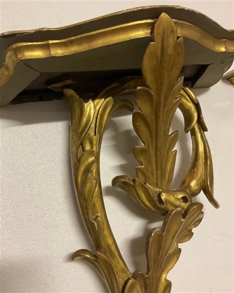 Coppia di mensole in legno intagliato, dipinto e dorato. Sostegno antico a volute fogliacee con piano sagomato (cm 58x63x25,5) (difetti e mancanze)