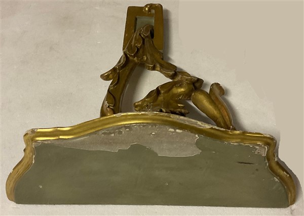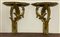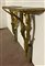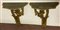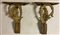 Coppia di mensole in legno intagliato, dipinto e dorato. Sostegno antico a volu