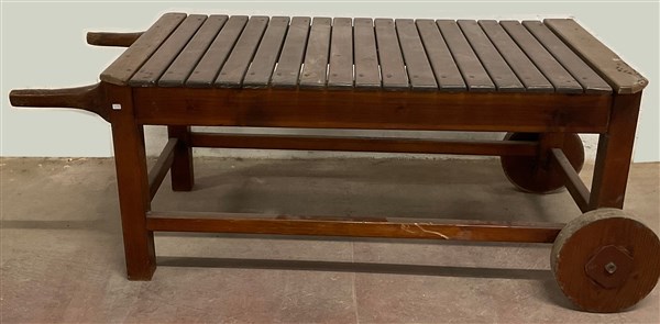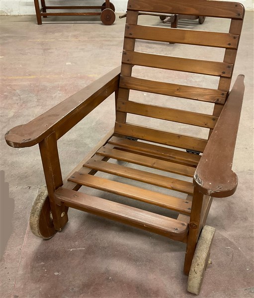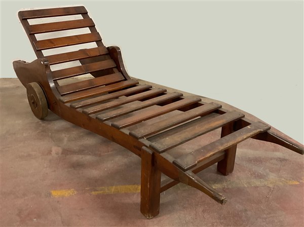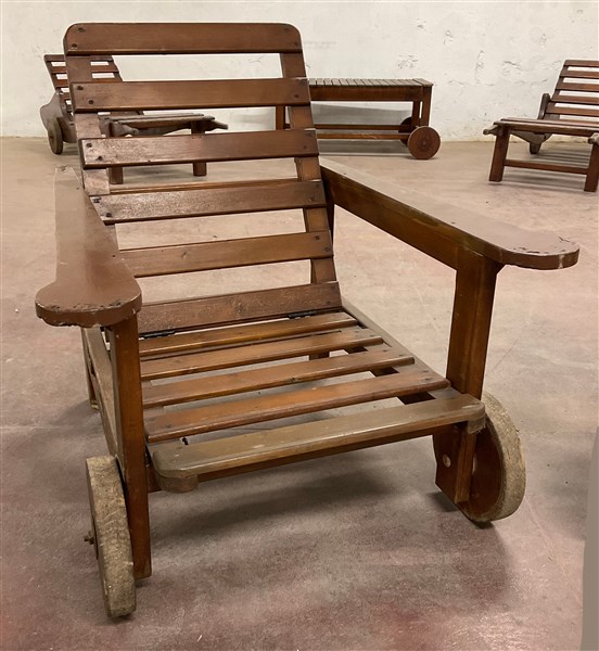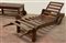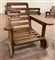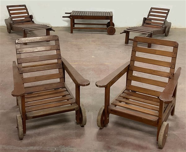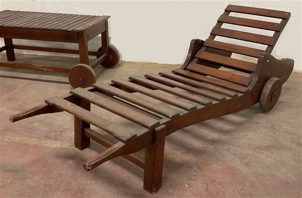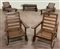 Fornitura da giardino composto da due lettini, due poltrone e due tavolini in legno di diversa misura (difetti)