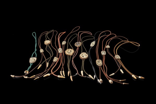 Quattordici cravatte da cacciatore in corone di cervo traforate ad animali, argento e pelle (difetti)