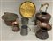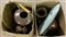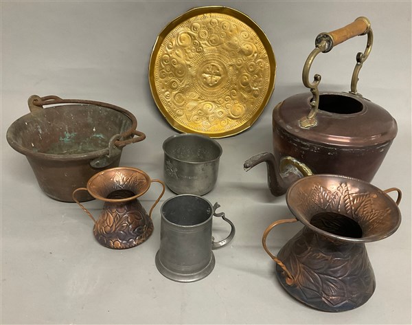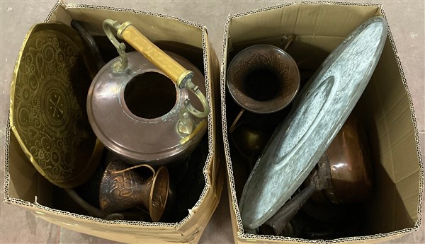Due cartoni contenenti vari oggetti per la tavola in rame e metallo (difetti)