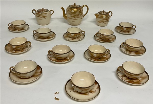 Servizio da the in ceramica con decoro policromo e oro a paesaggi composto da t