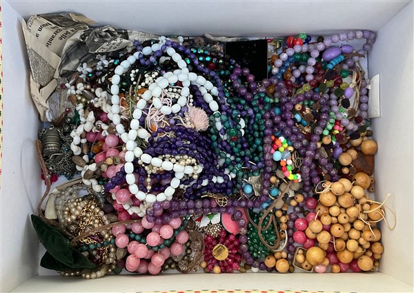 Scatola contenente bigiotteria varia in quarzo, ametista, perle di vasca e piet