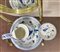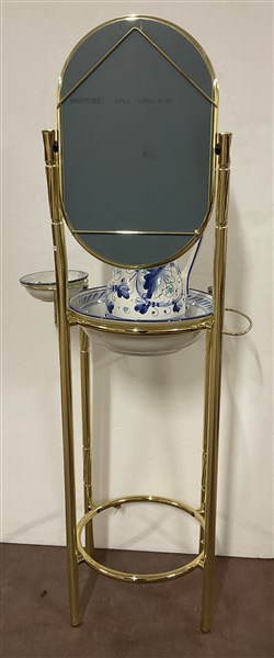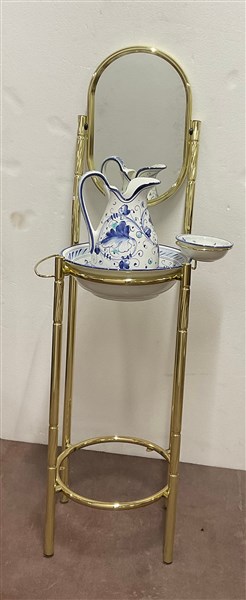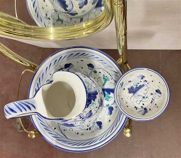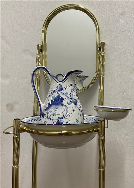 Trespolo da toilette in ottone con catino, brocca e portasapone in ceramica con