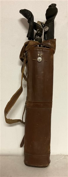Sacca in cuoio contenente diverse mazze e attrezzi da golf (lunghezza max cm 120) (difetti)