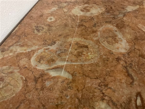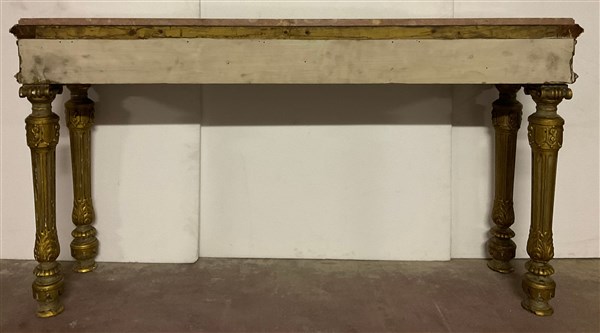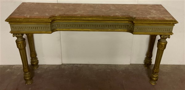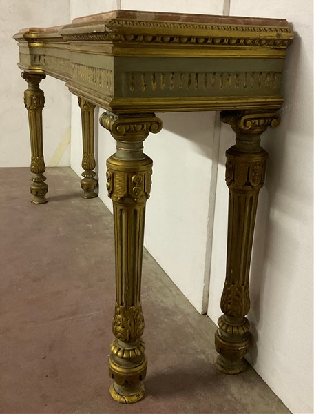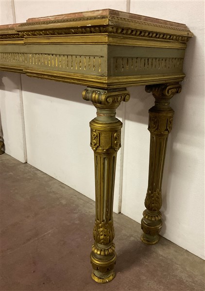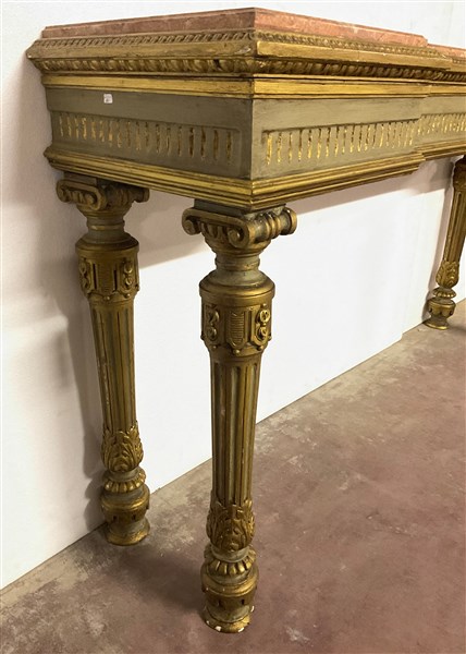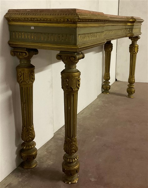 Tavolo da parete in legno intagliato dipinto e dorato con piano sagomato in marmo, gambe e fascia scanalate (cm 184x 88x41) (difetti)