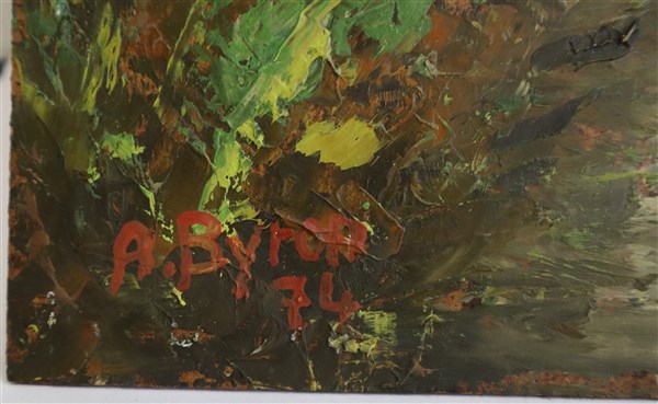 Lotto 1497 | A. Byron "Paesaggio" 1974, olio su masonite (cm 40x60) firmato e datato in basso