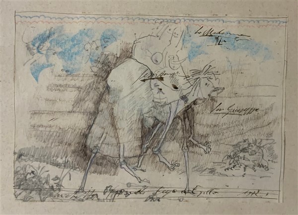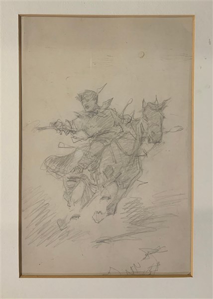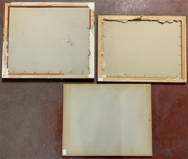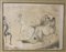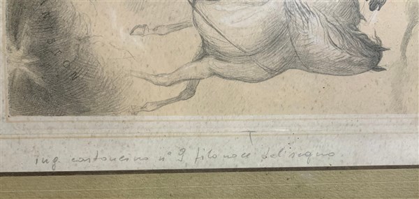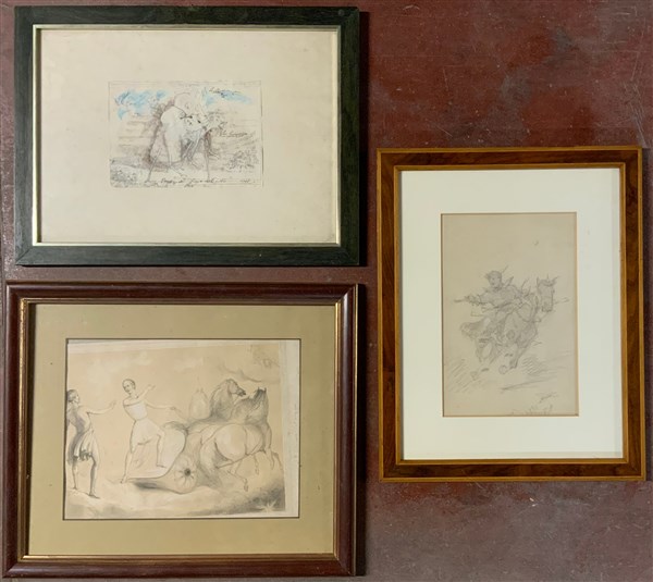 Lotto di due disegni e una stampa di diversi autori, soggetti e misure. In corn