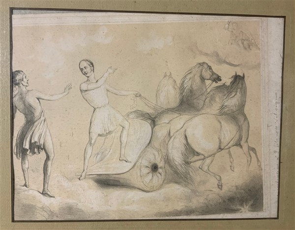 Lotto di due disegni e una stampa di diversi autori, soggetti e misure. In cornice (difetti)