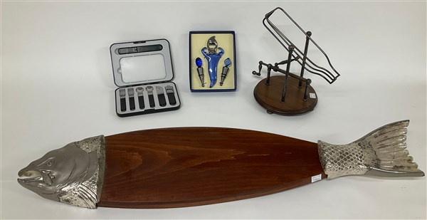 Lotto composto da un portabottiglie, un vassoio da salmone e due oggetti divers