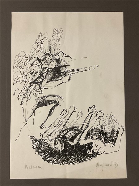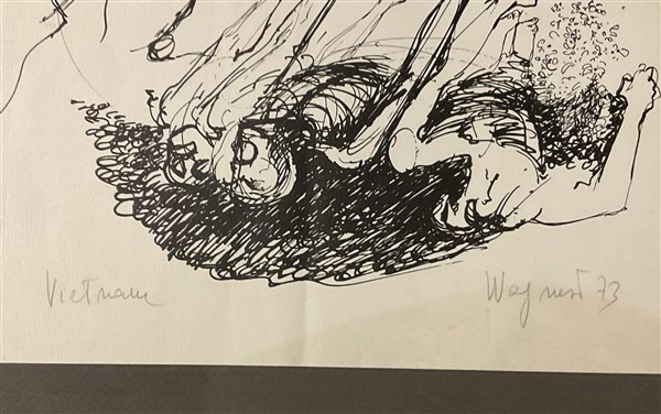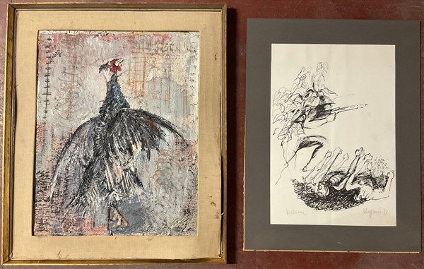 Lotto composto da un olio su tela (cm 49x39) firmato e datato '60 in basso a destra e una litografia in bianco e nero sul Vietnam (cm 44x30)