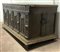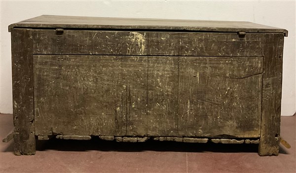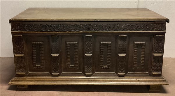 Cassone in rovere e legni vari con fronte decorato da intagli a volute intrecciate e pannellature con cornici guilloché. Secolo XVIII (cm 141x87x559) (difetti e restauri)