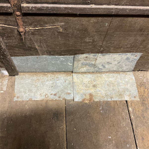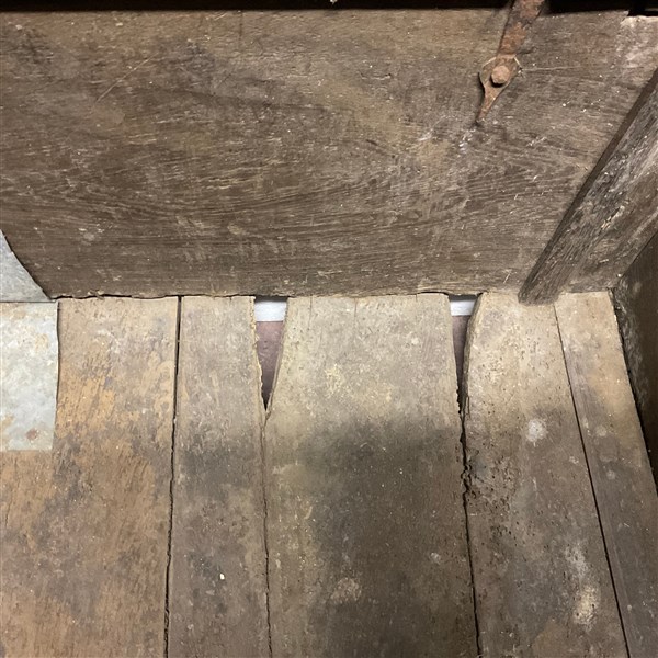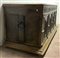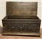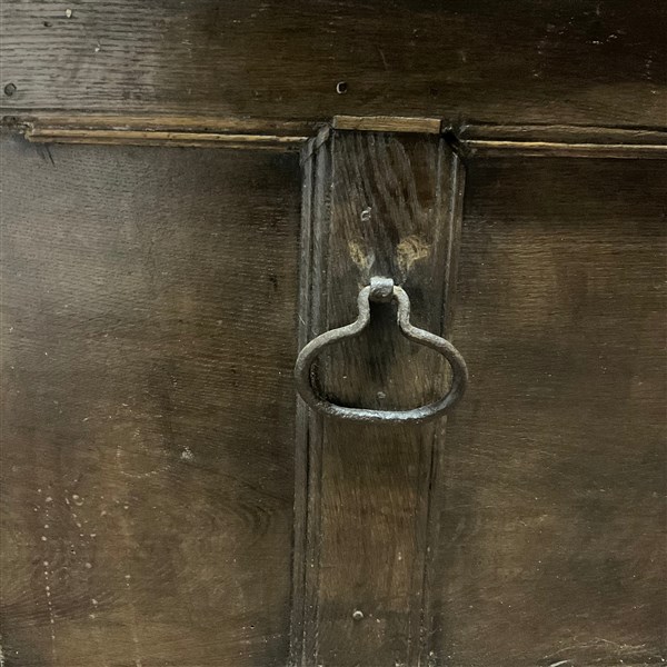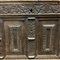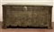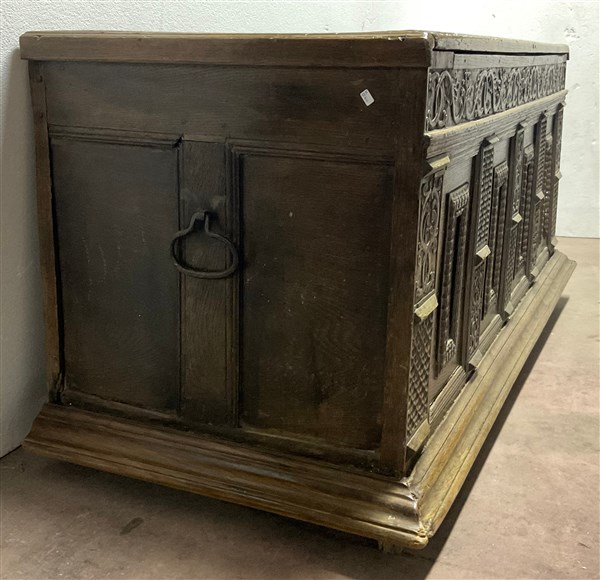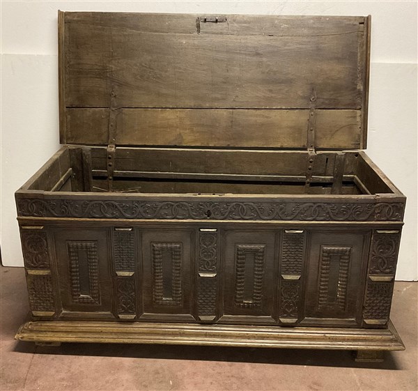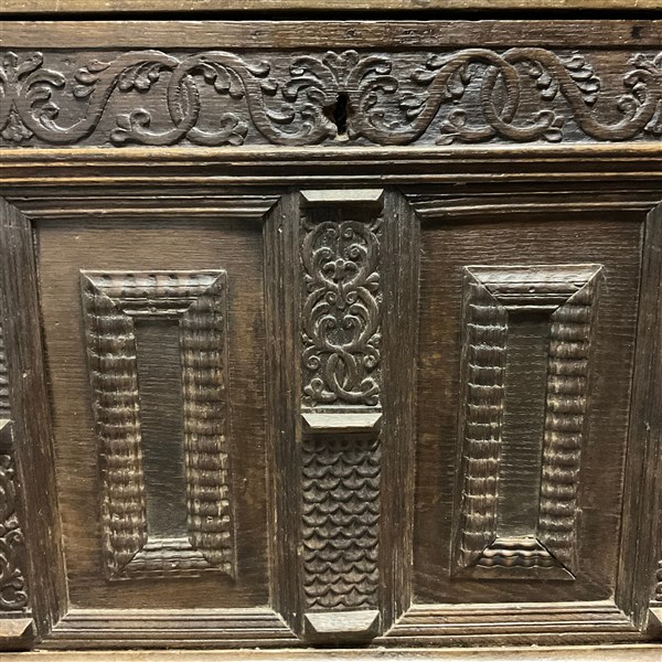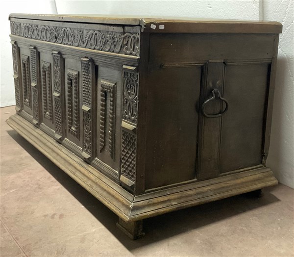 Cassone in rovere e legni vari con fronte decorato da intagli a volute intrecci