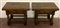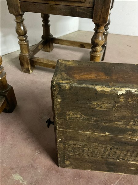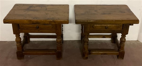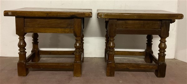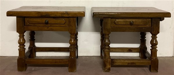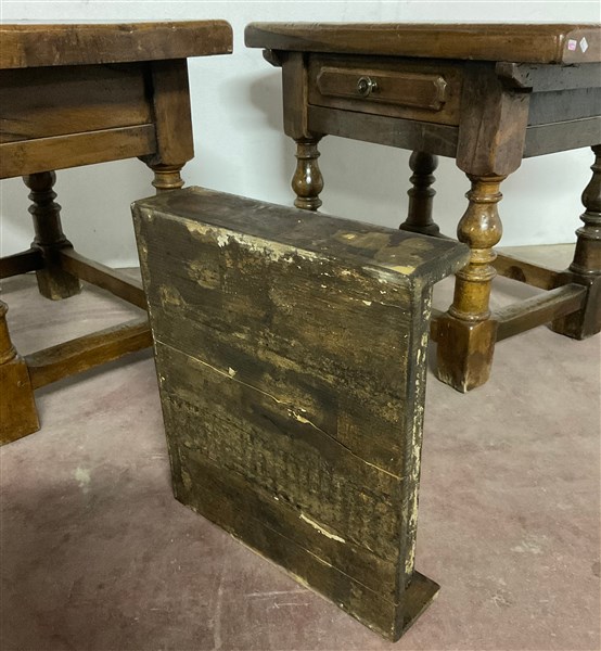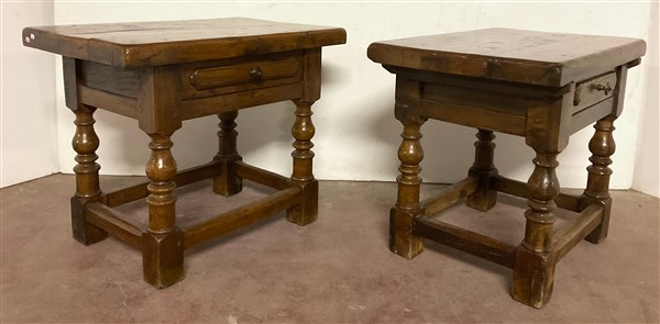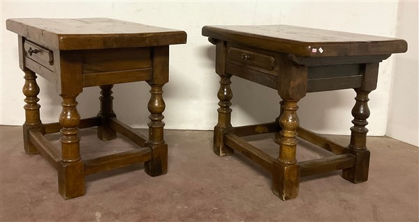 Due tavolini in legni vari con cassetto alla fascia e gambe tornite riunite da traverse (cm 70x56,5x45) (difetti)