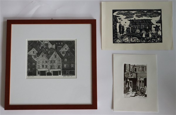 Lotto composto da due xilografie e un'acquaforte di soggetto, autori e misure diverse, tutte firmate, una di Ketil Kvam. Una in cornice