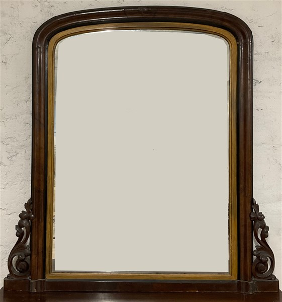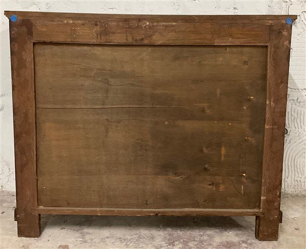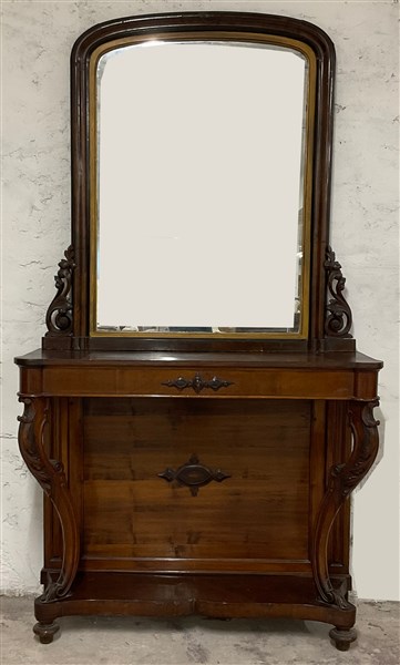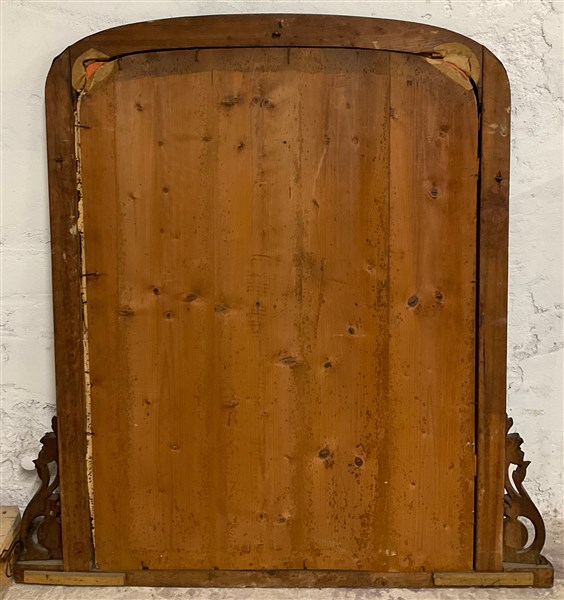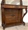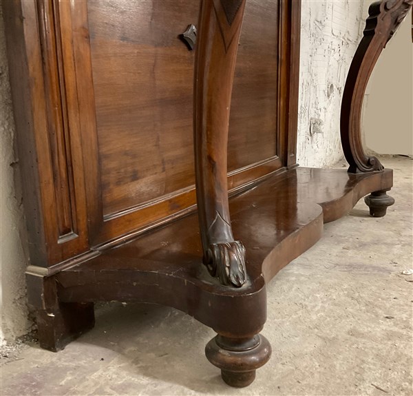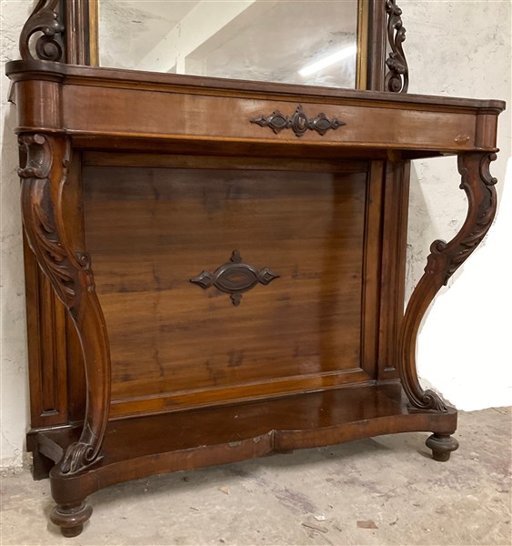 Tavolo da parete in legno con gambe mosse ed intagliate a motivi vegetali, piano e fascia stondati con cassetto, piedi anteriori torniti. Unito ad una caminiera in legno intagliato e traforato con profilo interno dorato. Secolo XIX (cm 127x228x42) (difetti)