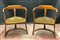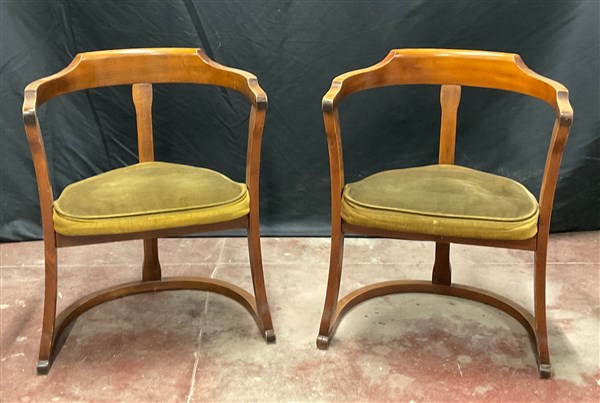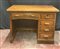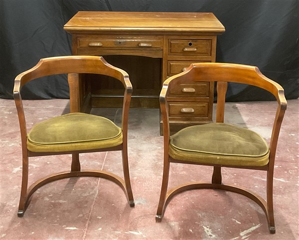 Scrivania da centro in legno con cinque cassetti di cui quattro in linea e due tiretti sui fianchi, primi decenni del secolo XX (cm 110x82x70), unita ad una coppia di sedie con schienali a giorno (difetti)