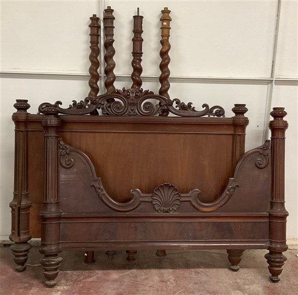 Letto in mogano con colonne a tortiglione e montanti scanalati (cm 237x135) (mancante delle traverse) (difetti e mancanze)