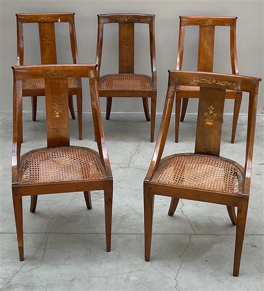 Gruppo di cinque sedie a gondola con schienale intarsiato in ottone (difetti e rotture)