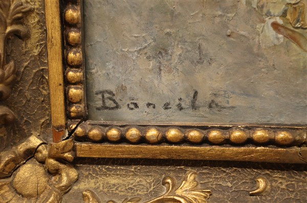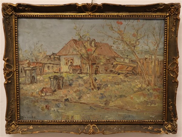 Firma indecifrata "Paesaggio con case e alberi" olio su cartone pressato (cm 50x70) Firmato in basso a sinistra. In cornice