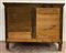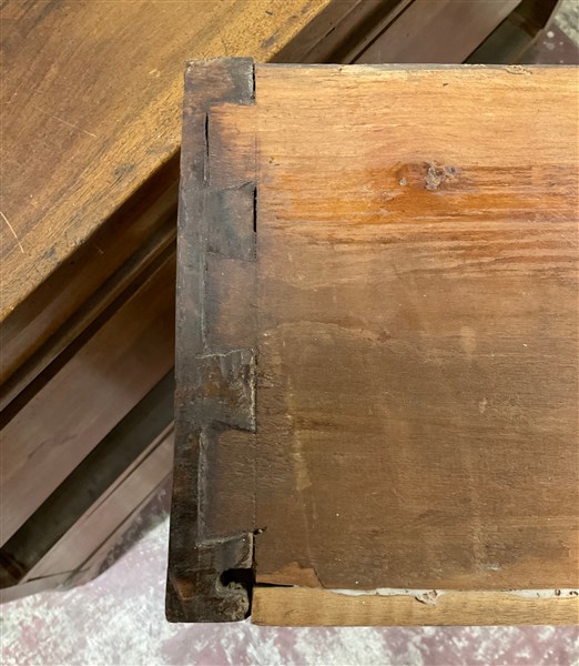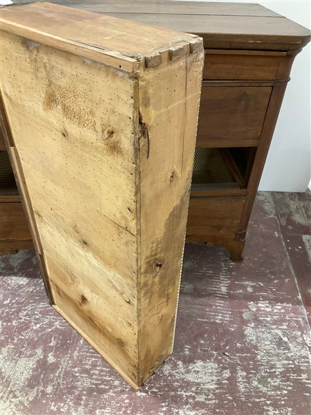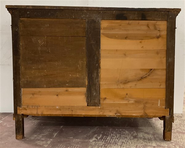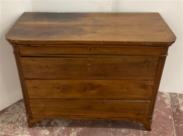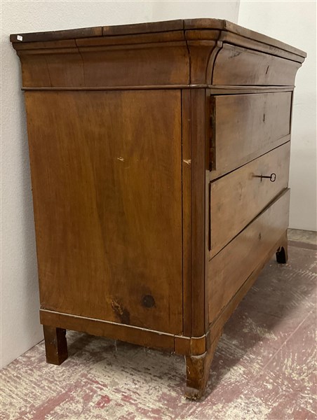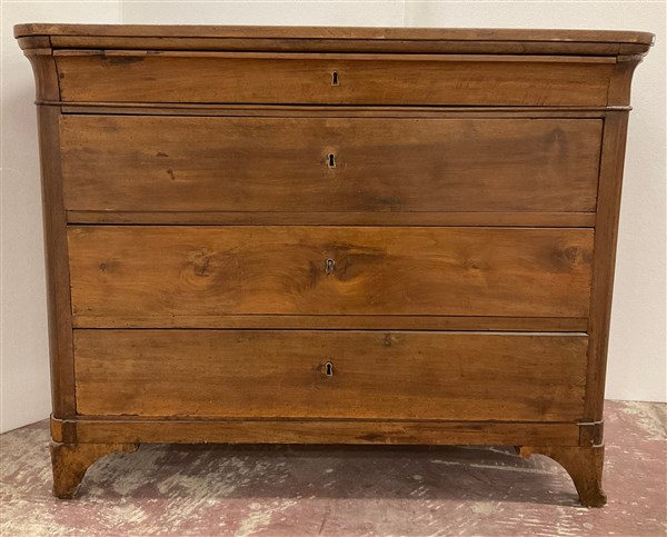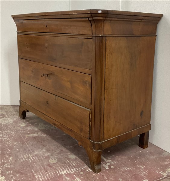 Cassettone in ciliegio a tre cassetti e mezzo, angoli stondati, piedi anteriori a mensola. Secolo XIX (cm 125x100x60) (difetti)