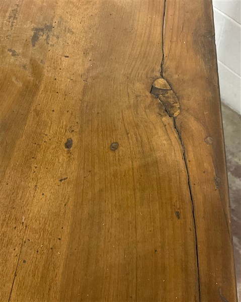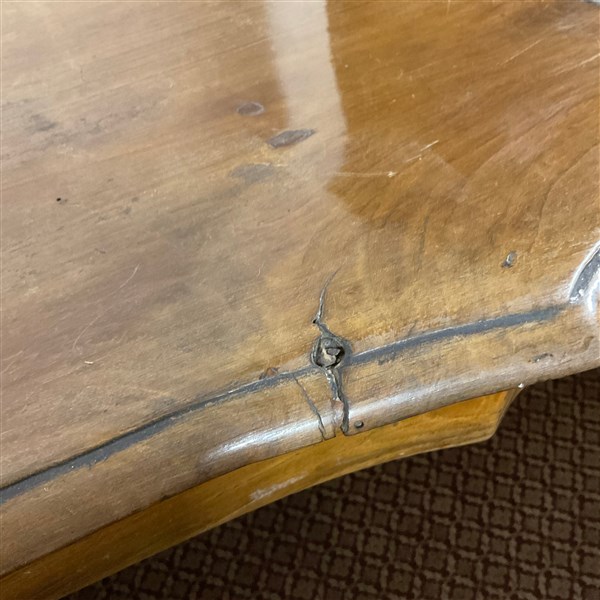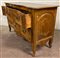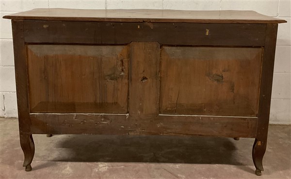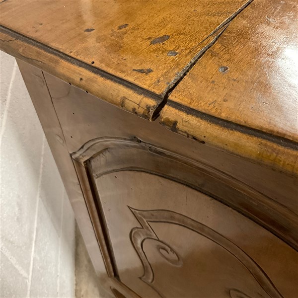 Comò in noce a due cassetti con fregi intagliati, fronte a doppia mossa, gambe e grembiale sagomati. Parma, secolo XVIII (cm 143x88x53) (difetti e restauri)
