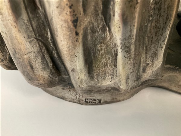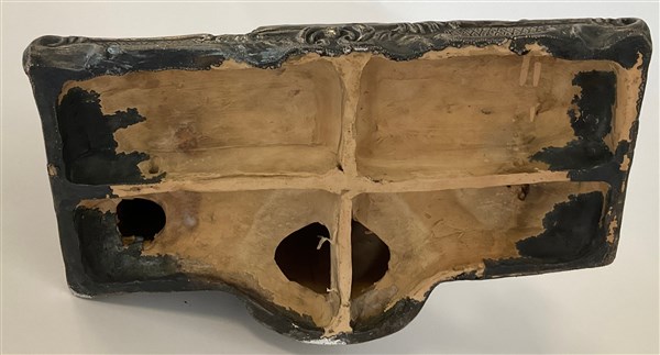 Scultura in terracotta dipinta e argentata raffigurante gentiluomini seduti al tavolo (cm 37x40) (difetti e mancanze)