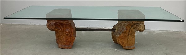 Tavolino da salotto con base composta da parti di antichi capitelli in marmo scolpito, traversa in ferro e piano in cristallo (cm 180x47x90) (difetti)