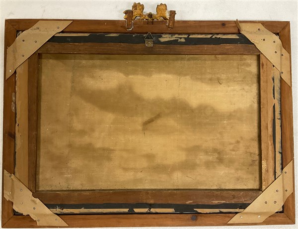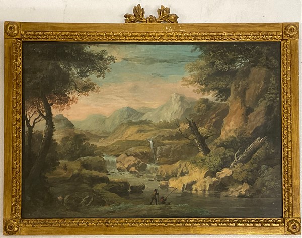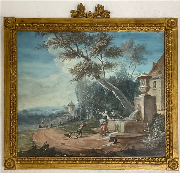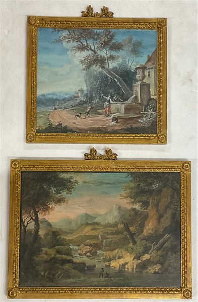 Ignoto di inizio XIX Secolo, Lotto di due gouache su carta di diversi soggetti e diverse misure. In cornici dorate e intagliate con cimasa (difetti)