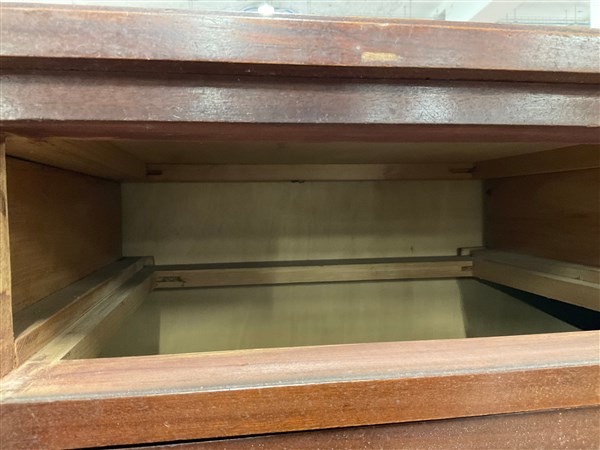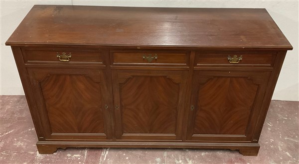 Credenza impiallacciata in mogano a tre ante e tre cassetti pannellati (cm 154xh 91x50) (difetti)