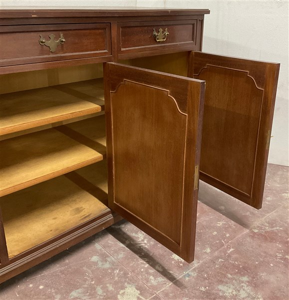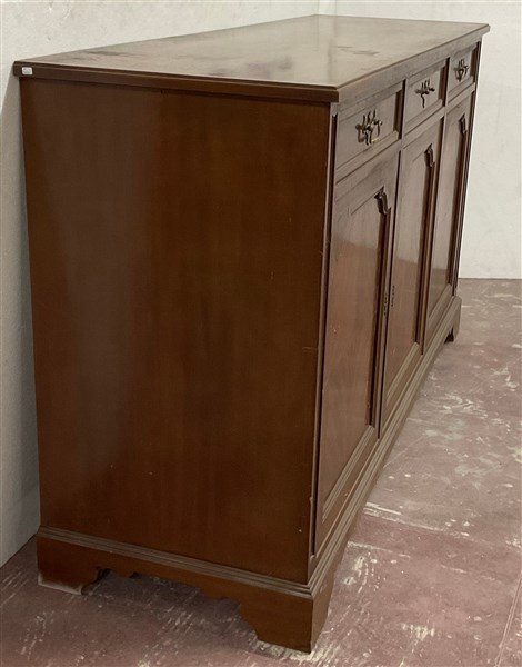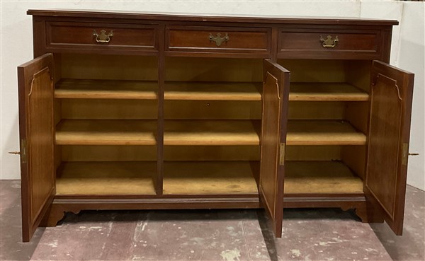 Credenza impiallacciata in mogano a tre ante e tre cassetti pannellati (cm 154x