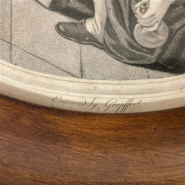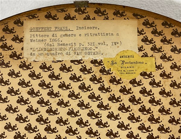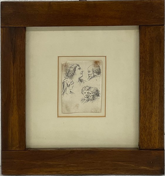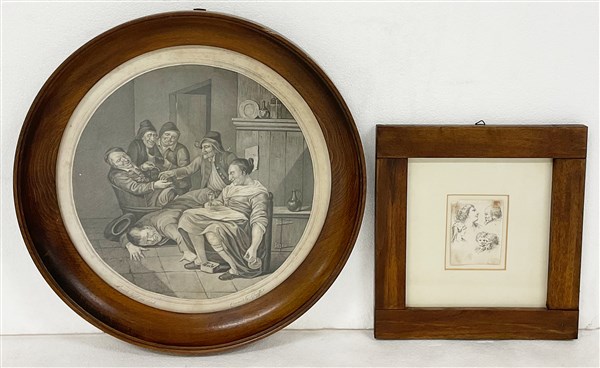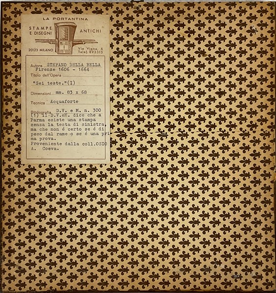 Lotto composto da due incisioni all'acquaforte su carta di cui una di Stefano Della Bella raffigurante teste (cm 8x6) e una di Franz Goeffert raffigurante scena d'interno (d cm 40) in cornici. Etichette al retro (difetti)