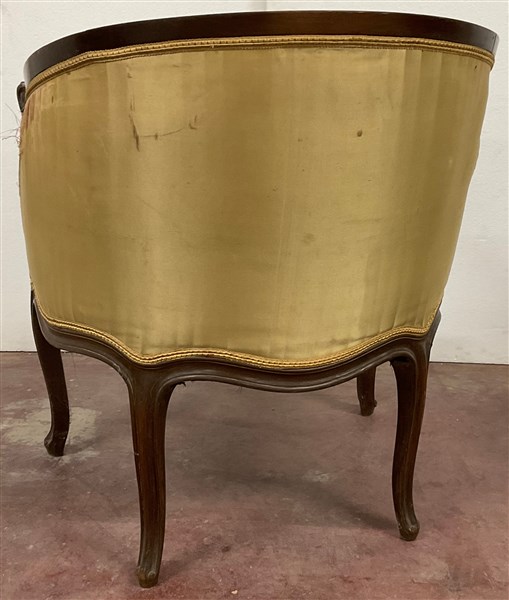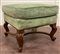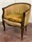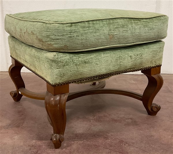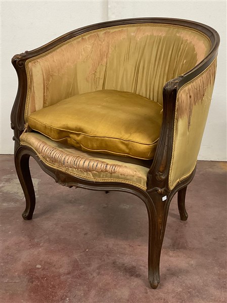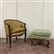 Lotto composto da una poltrona a pozzetto ed un poggiapiedi in legno intagliato a volute (cm 52x40x52) (difetti e rotture)