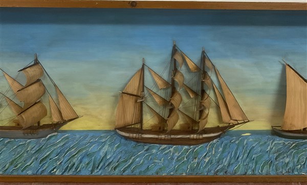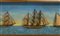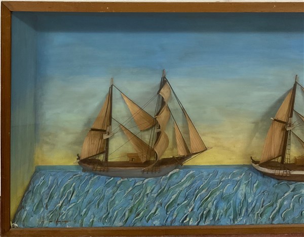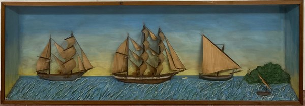 Grande diorama con tre vascelli in teca in materiali diversi (cm 212x h 71x15) (difetti)