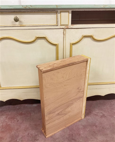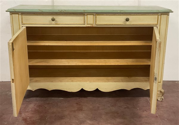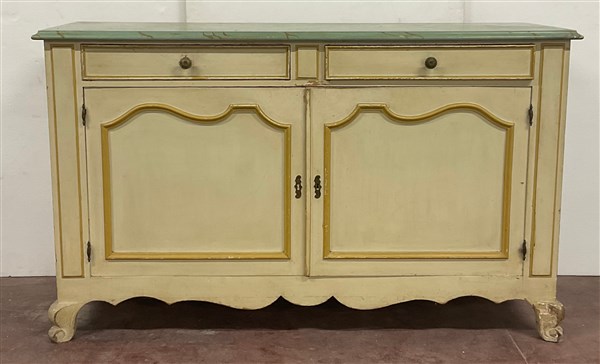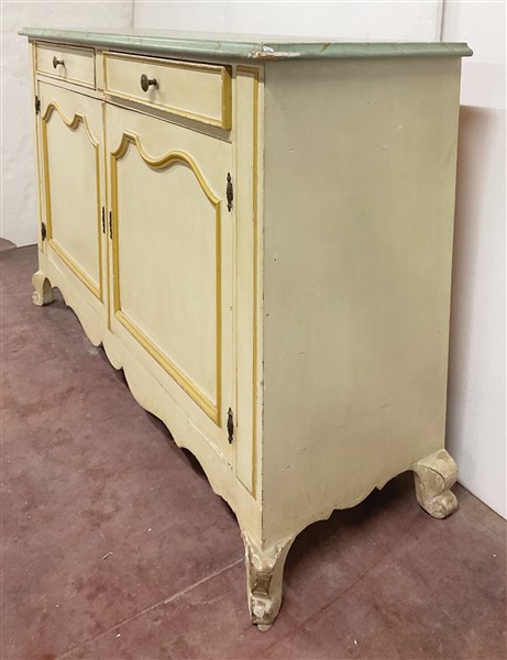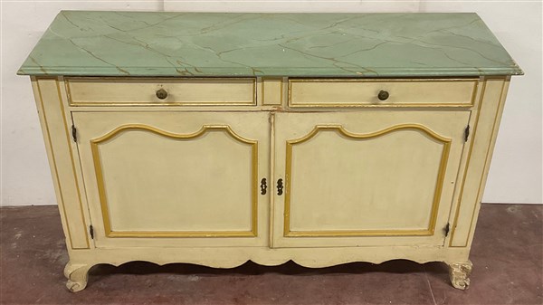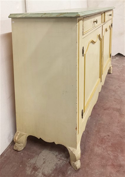 Credenza il legno laccato color crema con piano a finto marmo, a due ante panne