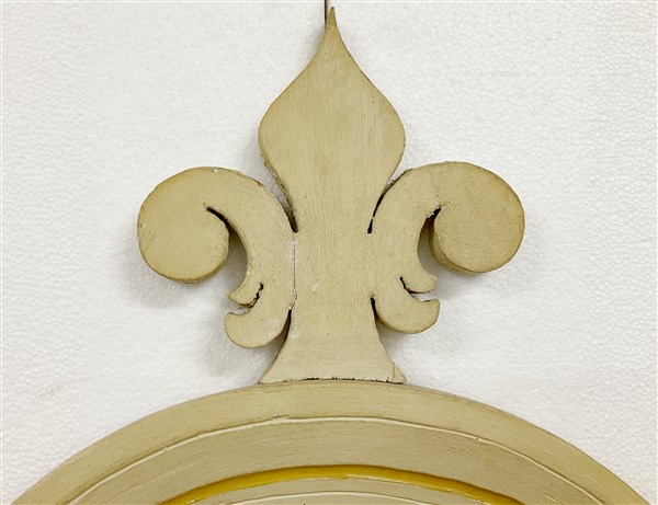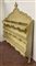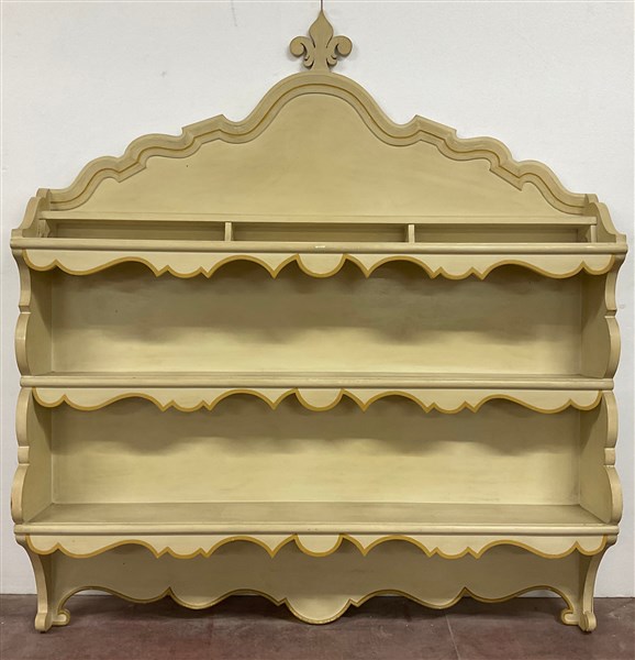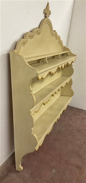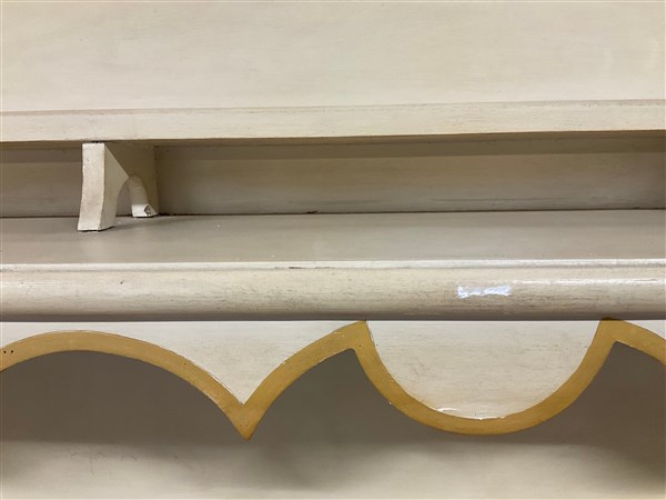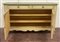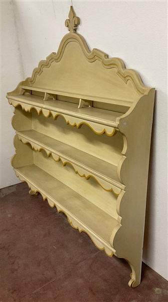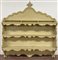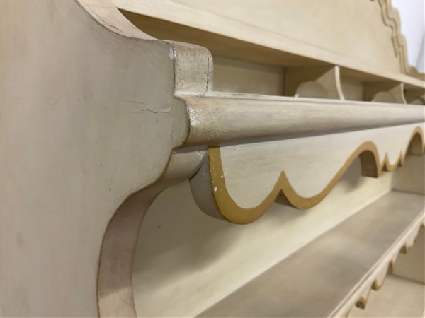 Credenza il legno laccato color crema con piano a finto marmo, a due ante pannellate e due cassetti sottopiano (cm 156xh 95x49) unita ad una piattaia in legno laccato a tre ripiani con cimasa mistilinea (cm 151xh 169x25) (difetti)