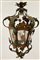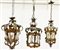 Lotto di tre diverse lanterne a sospensione in lamierino con vetri dipinti in p